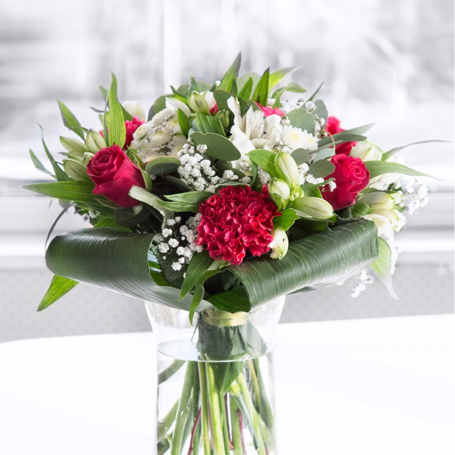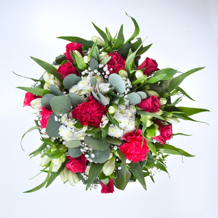 Experience timeless elegance with our Classic Beauty Bouquet. This exquisite arrangement combines white chrysanthemums and gypsophila with bold red roses and carnations, complemented by white alstroemeria and aspidistra leaves. Each flower is carefully selected to ensure a harmonious and luxurious display.