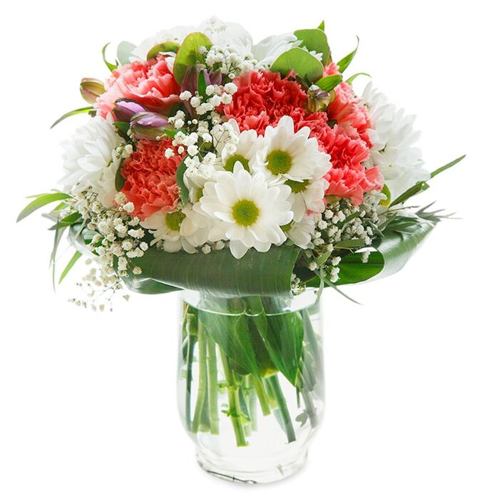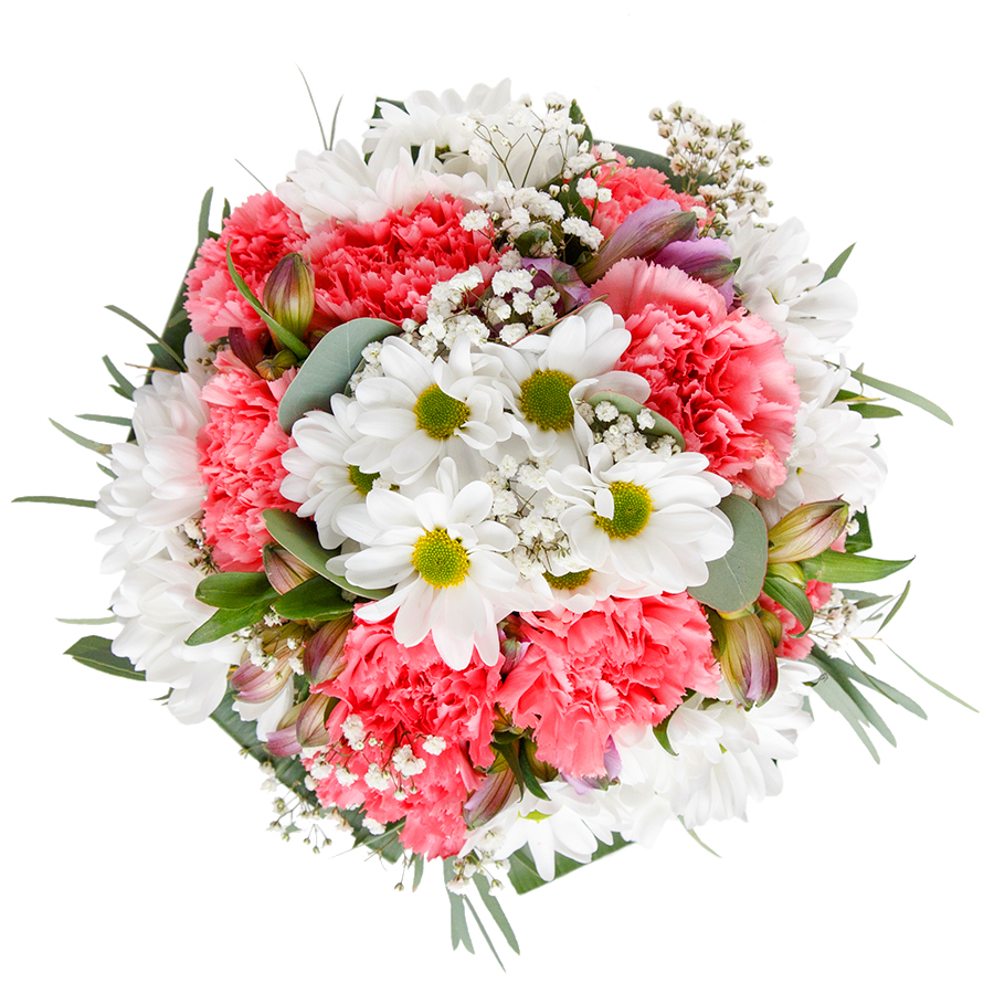 Immerse yourself in the stunning combination of white and pink blooms with our exceptional flower arrangement. Featuring white chrysanthemums, light pink carnations, airy gypsophila, and lush aspidistra leaves, each flower is hand-selected for supreme freshness and quality.